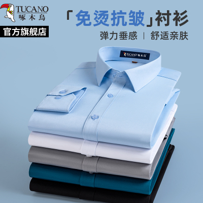 啄木鸟白色衬衫男士长袖2024秋季工装免烫抗皱爸爸装短袖衬衣春秋