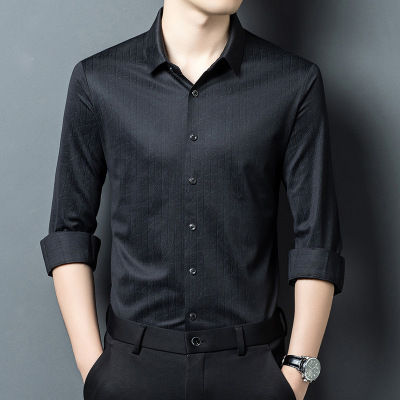 秋季新款男士长袖衬衫弹力条纹无痕上衣中年商务透气打底衬衣