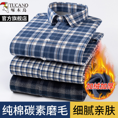 啄木鸟格子衬衫男士长袖2025新款春季纯棉磨毛加绒加厚爸爸寸衬衫
