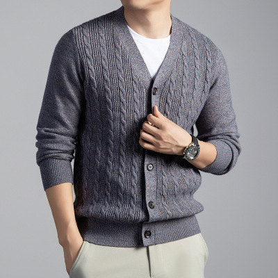 羊毛针织开衫男秋季新款时尚V领提花男士毛衣外套