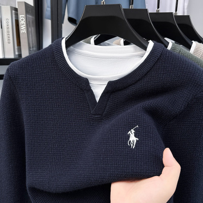 加厚针织假两件针织衫男秋冬新款时尚刺绣休闲保暖男士毛衣