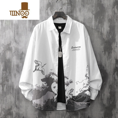 YANXU简约日系复古浮世绘长袖衬衫男冬季宽松潮流中国风青少年古风衬衣