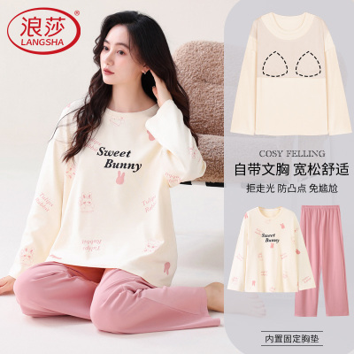 浪莎睡衣女纯棉长袖高级大码女士带胸垫春秋家居服甜美套装25新款