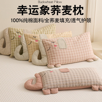 卡通幸运小象枕荞麦枕头单人儿童纯棉草本护颈椎助睡眠低枕芯