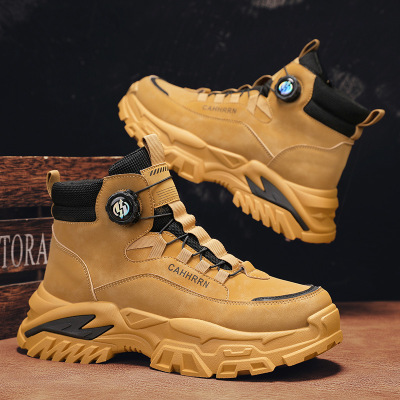 秋冬高帮皮面马丁靴厚底增高旋转纽扣免系带工装户外运动靴男靴