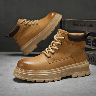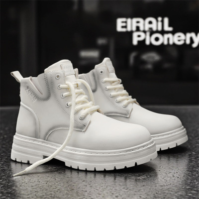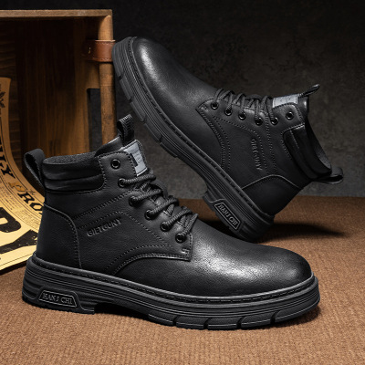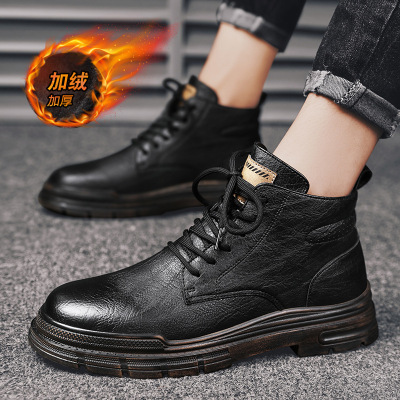 男鞋秋冬季新款纯色皮面厚底百搭高帮马丁靴工装休闲运动潮流男靴