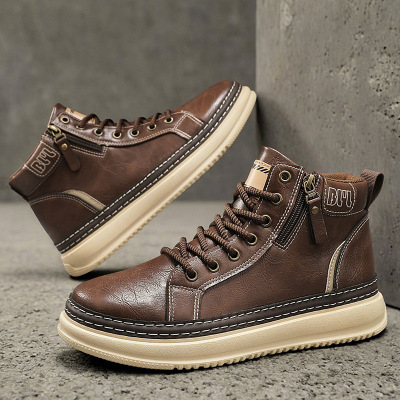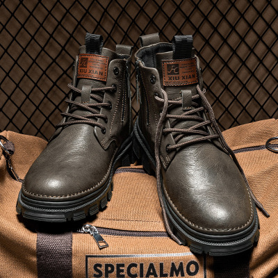 男靴秋冬季新款复古潮鞋拉链皮革百搭马丁靴高帮厚底防滑男鞋
