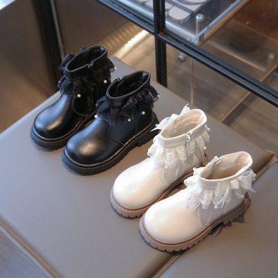 女童皮靴秋冬新款蕾丝英伦风马丁靴韩版女孩时尚加绒防滑短靴