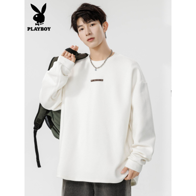 花花公子白色长袖t恤男士宽松服装春秋新款德国天鹅绒底裤男士秋季t恤