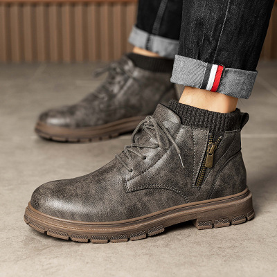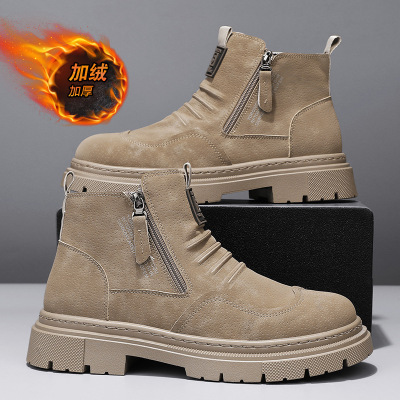 加绒马丁靴冬季新款侧拉链套脚保暖复古欧洲站工装皮靴运动男靴