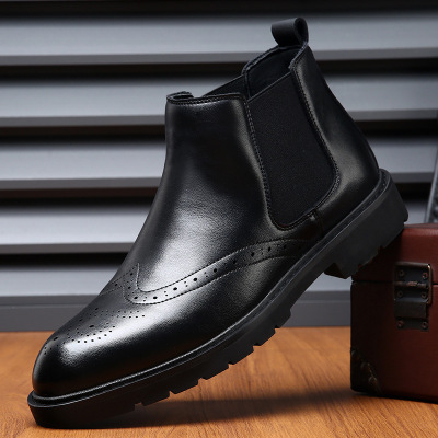 英伦风切尔西短靴男士套脚马丁靴加绒百搭布洛克雕花商务高帮皮靴_384