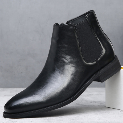 高端复古尖头切尔西靴男士一脚蹬休闲真皮英伦风皮靴中帮马丁靴潮