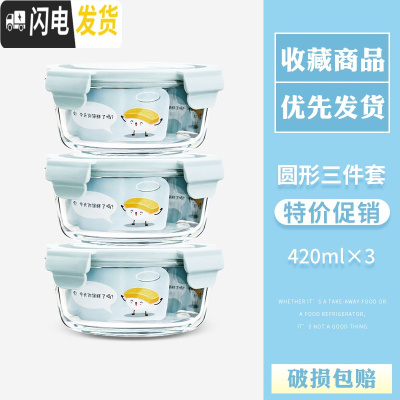 三维工匠冰箱保鲜盒家用耐热玻璃碗带盖可微波炉加热便当盒带饭饭盒上班族 [岩蓝]420+420+420.《小号保鲜碗》