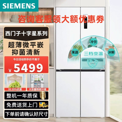 西门子[十字星系列玻璃门]497升四开门变频电冰箱 60.9cm超薄机身微平嵌 支持国家补贴 KC82EA256C