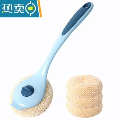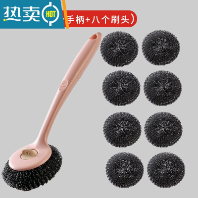 敬平长柄锅刷厨房清洁洗锅刷子家用去污多功能洗碗刷锅钢丝球刷锅器 粉色[一把手柄+8个刷头]