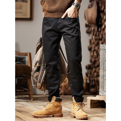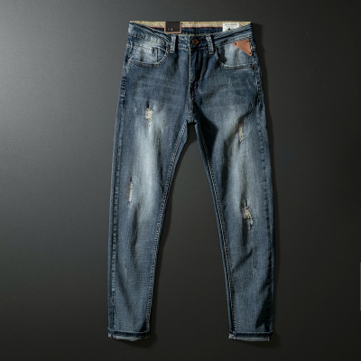 春秋常规男式弹力牛仔裤 男青年复古磨破做旧合体休闲小直脚长裤