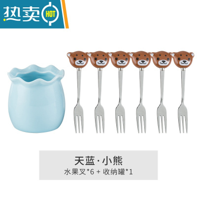 敬平304水果叉子儿童安全勺子卡通不锈钢点心小叉可爱熊猫水果叉套装 蓝色小熊6叉1罐 SUS304牙签