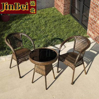 锦北藤椅阳台桌椅室外庭院藤编椅子花园茶几藤椅组合2椅+60黑玻璃圆桌