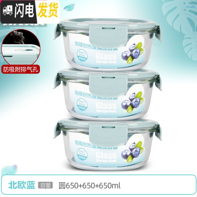 三维工匠上班族可微波炉加热专用玻璃饭盒餐盒便当碗带盖冰箱水果盒保鲜盒 [北欧蓝]圆650+650+650