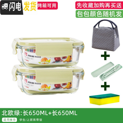 三维工匠饭盒上班族微波炉加热专用玻璃碗带盖密封保鲜水果便当盒家用分隔 [绿色]长650+长650+包+餐具+海绵擦