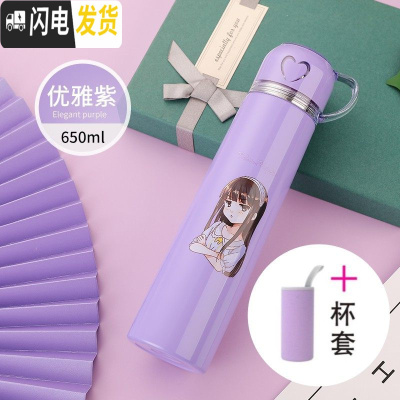 三维工匠保温杯不锈钢男女水杯子学生便携创意简约可爱儿童大容量水壶定制 紫公主650+杯套