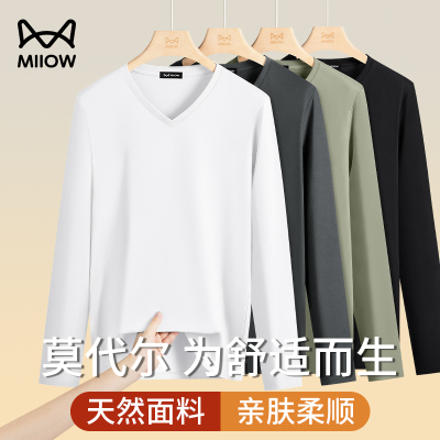 猫人50S丝光莫代尔棉V领长袖T恤2026新款春秋男士打底衫内搭上衣