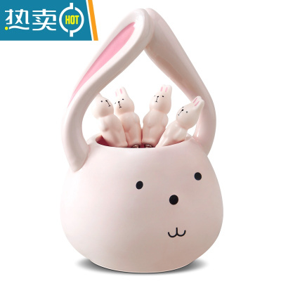 敬平超萌陶瓷水果叉篮套装创意不锈钢吃水果签果插创意家用可爱点心叉 兔子叉蓝套装(配6个叉)
