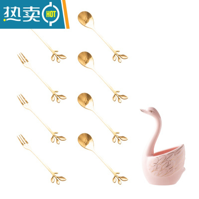 敬平家用时尚天鹅水果叉套装创意不锈钢水果叉子可爱点心叉甜品小叉签 粉天鹅金树叶叉勺(4叉4勺)牙签