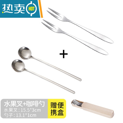 敬平水果叉套装304不锈钢水果叉子家用点心叉蛋糕甜品叉咖啡搅拌勺 2只银色叉子+2只银色勺子[送便携盒]牙签