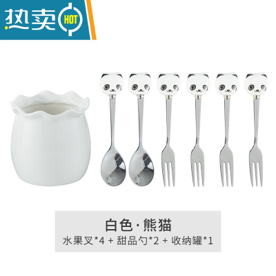 敬平304水果叉子儿童安全勺子卡通不锈钢点心小叉可爱熊猫水果叉套装 白色熊猫4叉2勺1罐 SUS304牙签