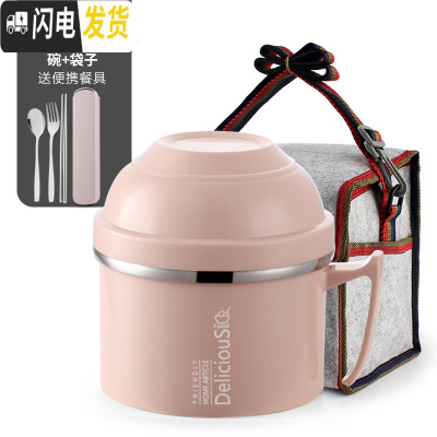 三维工匠304不锈钢保温饭盒泡面碗带盖学生宿舍便当盒便当碗快餐杯双层 北欧粉(送便携餐具+袋)