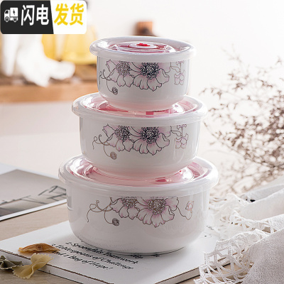 三维工匠陶瓷保鲜碗三件套冰箱收纳盒微波炉碗密封带盖大号便当盒面碗定购 花之韵(关注收藏优先发货)