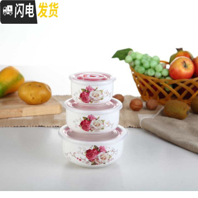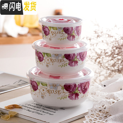 三维工匠陶瓷保鲜碗三件套冰箱收纳盒微波炉碗密封带盖大号便当盒面碗定购 合板玫瑰(关注收藏优先发货)