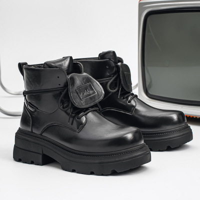经典黑色百搭皮靴子男士大头厚底增高鞋马蹄跟时尚德比鞋马丁男鞋
