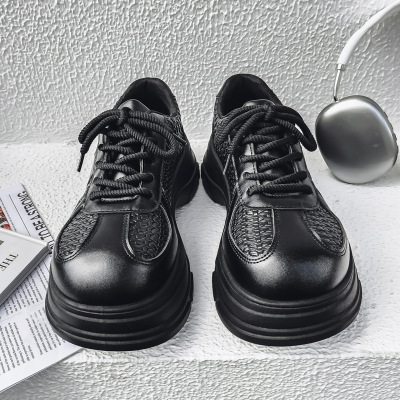 情侣秋季黑色皮革拼接圆头低帮正装工作休闲皮鞋厚底亮面休闲皮鞋