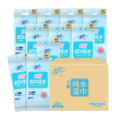清风 湿巾纯水湿纸巾小包EDI清洁擦脸独立包装便携10片*10包*1箱