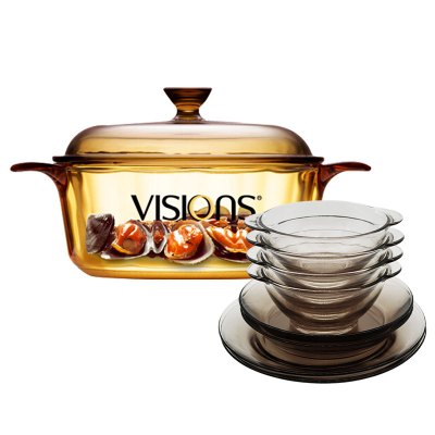 康宁(VISIONS)3.25L晶彩玻璃锅/茶色八件套 厨具套装 汤锅 炖锅 透明锅厨具套装透明耐热玻璃碗碟深浅盘 餐具