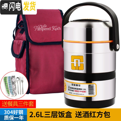 三维工匠304不锈钢保温饭盒提锅3层便当带饭盒超长大容量保温桶 304提锅2.6+酒红色方包+餐具