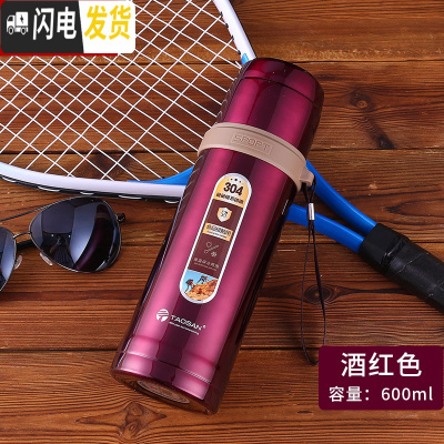 三维工匠大容量保温杯男士便携304不锈钢水杯女学生户外运动水壶旅行杯子 酒红色600赠杯套杯刷