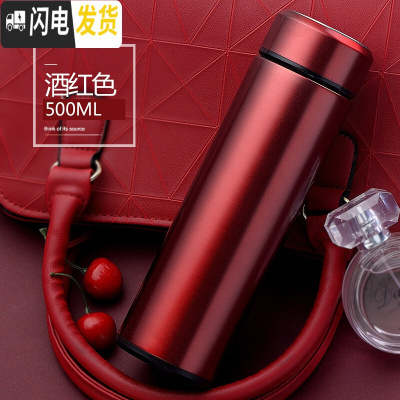 三维工匠办公保温杯不锈钢家用户外便携水杯男大号旅行车载大容量保温瓶 酒红色带茶隔.500