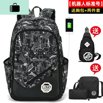 书包男时尚潮流高中初中学生大容量小学生校园双肩包韩版休闲背包NEW LAKE 机器人USB版(送胸包+两件套)