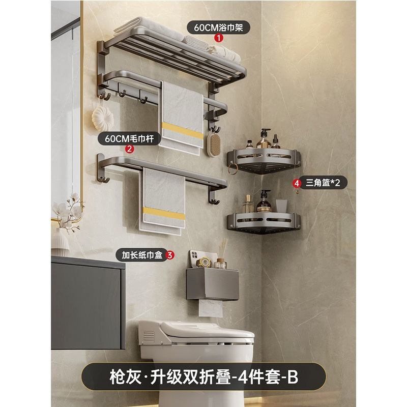 汉德斯科枪灰太空铝折叠毛巾架毛巾杆免打孔浴室置物架卫生间洗漱台收纳挂架 4件套B 打孔/免打孔两用