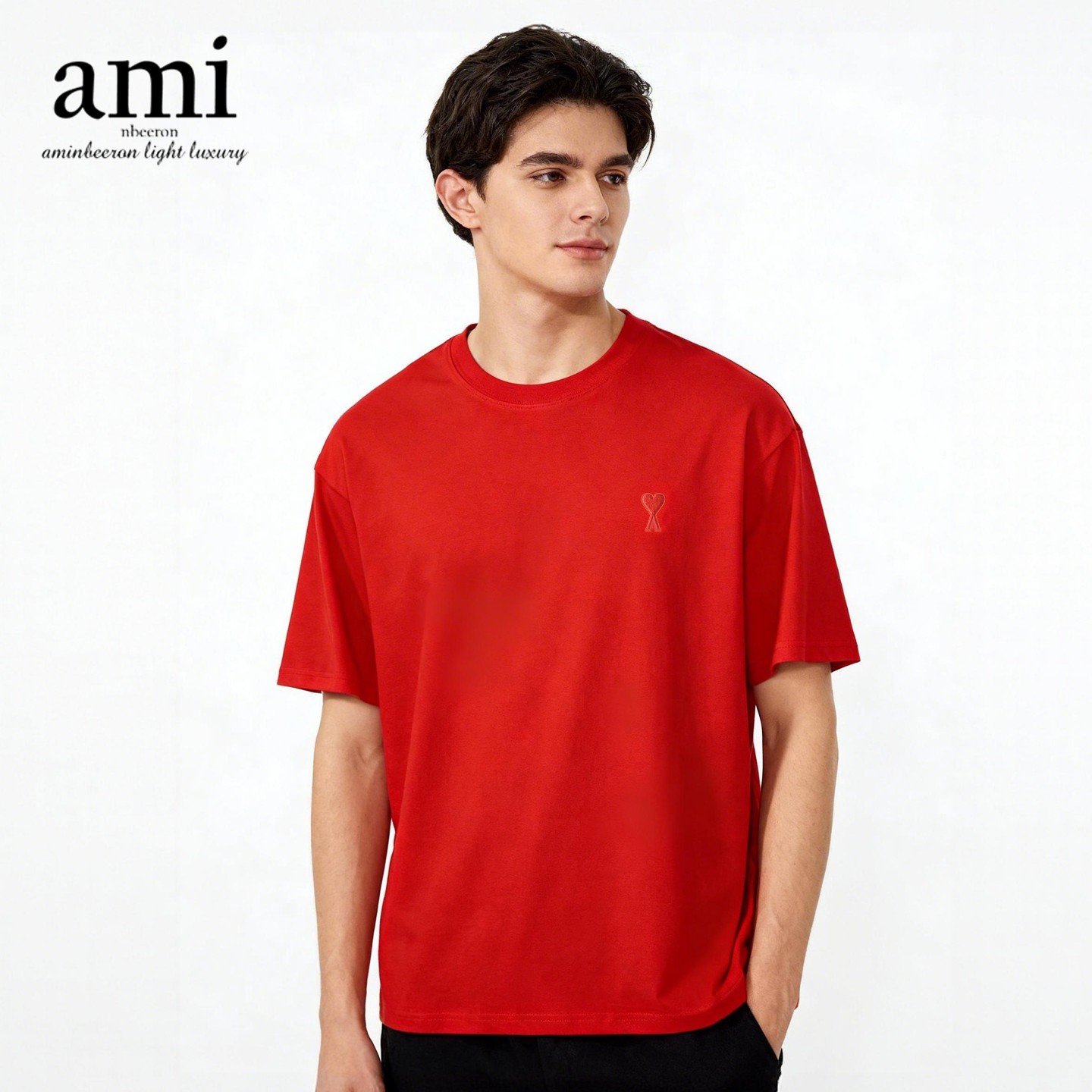 ami nbeeron纯棉短袖t恤重磅新疆棉圆领打底衫男女百搭休闲轻奢T M 红色