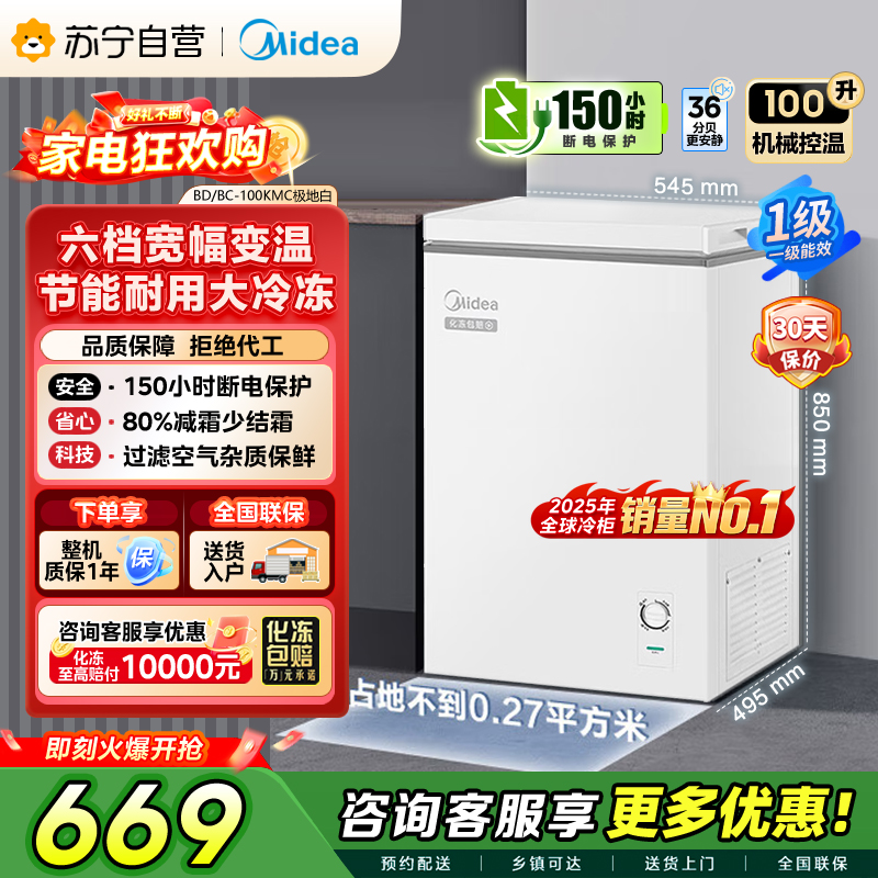 Midea美的100升冷藏冷冻转换小冰柜白色家用囤货小冷柜一级能效极地白[BD/BC-100KMC]