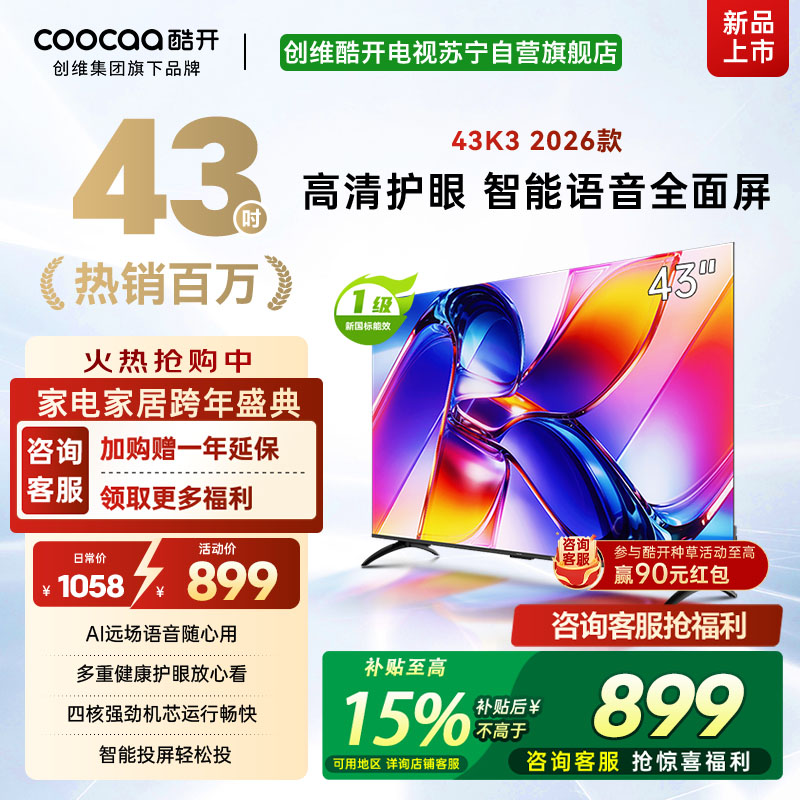 创维酷开43英寸电视K3 AI远场语音 一级能效 多重健康护眼 智能便捷投屏 高清全面屏电视机 43P3F Pro
