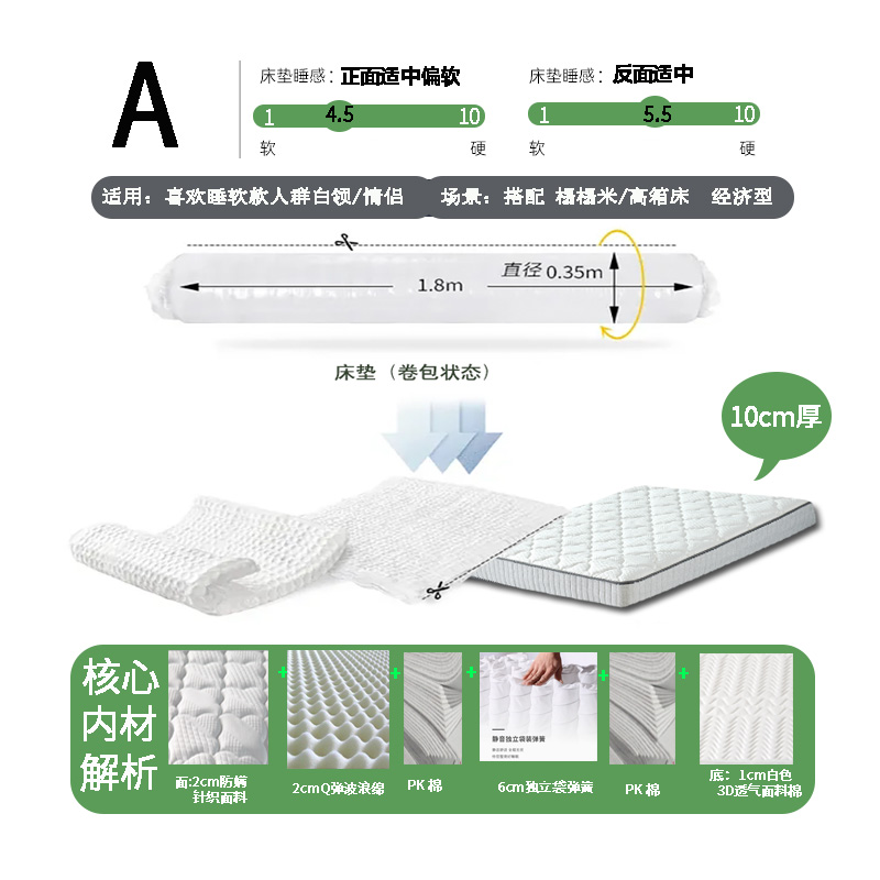 云梦云压缩卷包床垫乳胶记忆棉弹簧卷包床垫酒店民宿榻榻米床垫 10cm厚6cm弹簧+Q弹棉+防螨针织 200*200cm