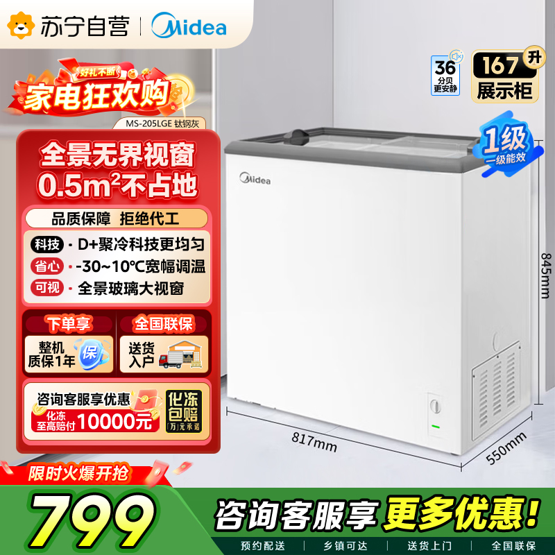 [自营]美的冰箱(Midea)小冰柜167升小型冰箱商用展示柜摆摊大容量雪糕陈列柜饮料水果冷藏保鲜柜MS-205LGE