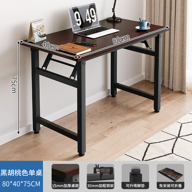 可折叠电脑桌台式卧室家用办公学习小户型书桌子简易长方形出租屋 15mm加厚桌面加固钢架黑胡桃色80x40免安装