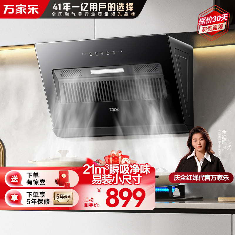 顶侧双吸26m大吸力油烟机侧吸式烟机顶吸7字机挥手智控感应烟灶联动家用自动洗,不粘涂层方便清洗,质保5年,万家乐大品牌值得信赖