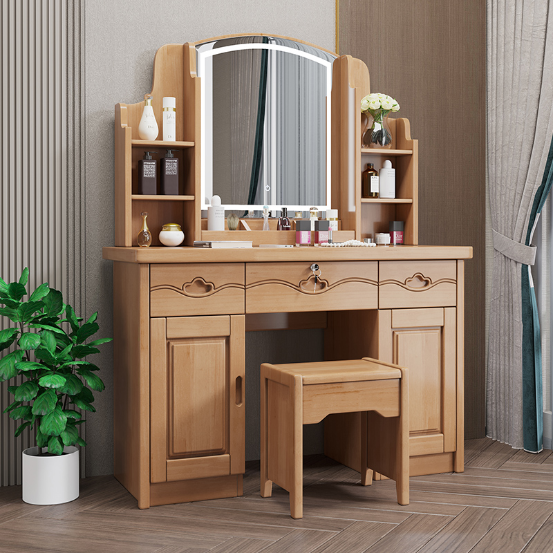 青木川 中式实木梳妆台斗柜主卧室房间带灯2023新款小型网红多功能床边化妆桌雕花化妆柜简约现代化妆桌 榉木色【不带灯】